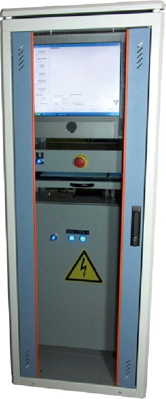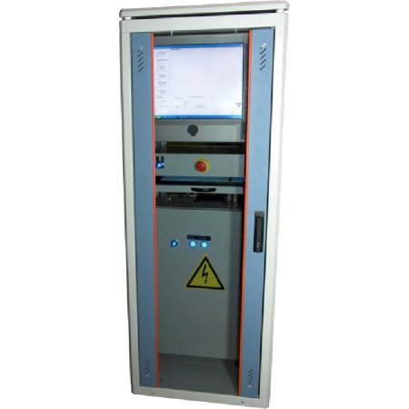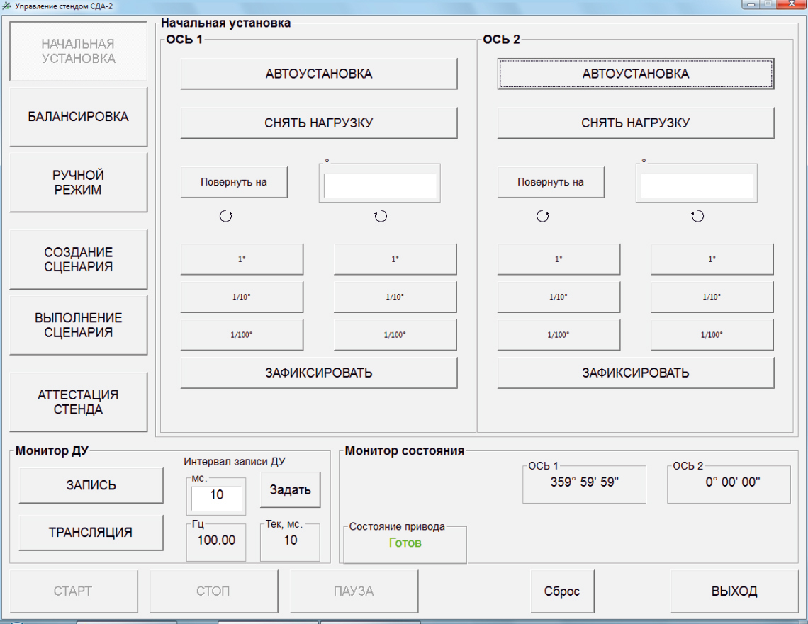 Система управления стендом состоит из промышленного компьютера с сенсорным экраном и специализированным программным обеспечением StendControl, цифровых сервоконтроллеров и специализированного блока для обработки показаний цифровых датчиков углового положения осей стенда, установленных в 19’’ стойку.